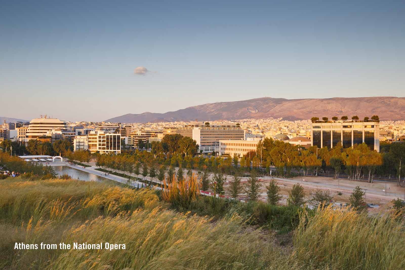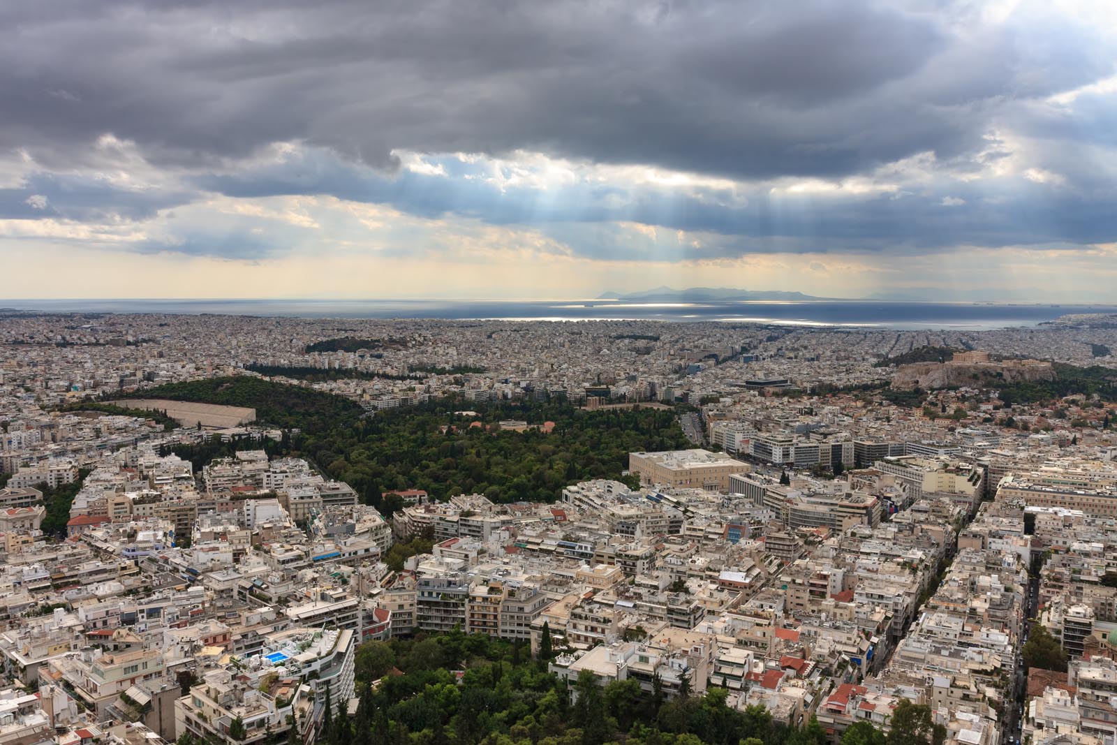 Aerial view over Athens with Piraeus in distance
